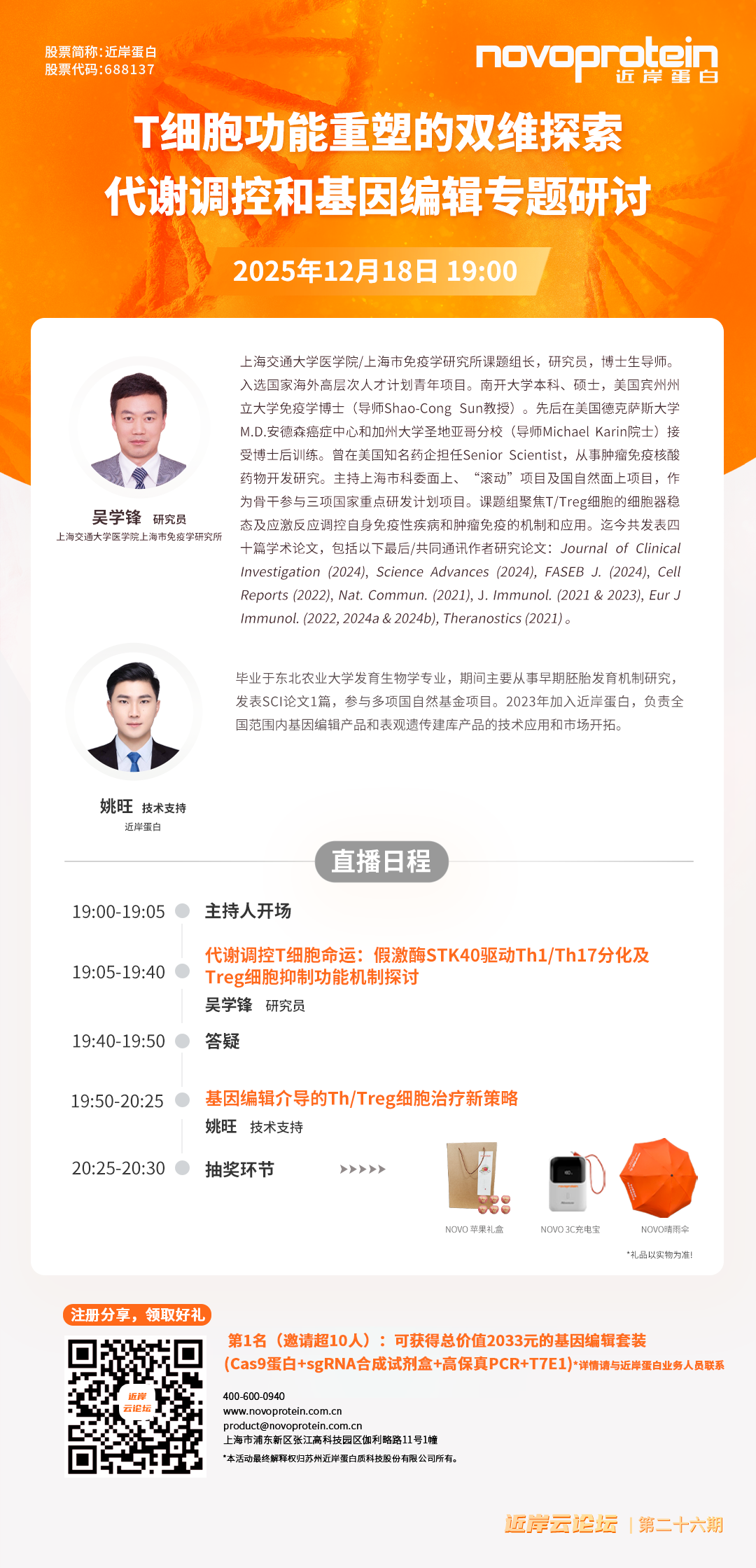 此外,近岸蛋白技术支持姚旺也将在“基因编辑介导的Th/Treg细胞治疗新策略”上为大家讲解技术进展与相关行业情况。讲座预约通道已开启,欢迎报名参加,共同探讨T细胞功能研究与转化应用!